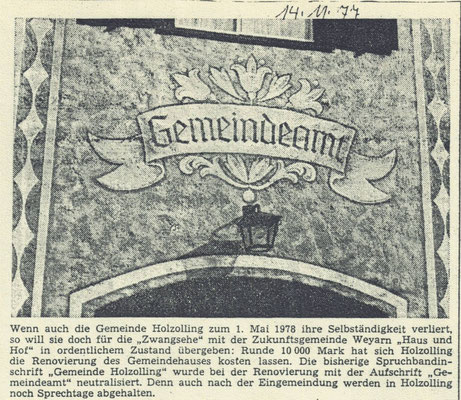 Einweihung am 23. August 1953. Sitz der Gemeindeverwaltung Holzolling bis zur Gebietsreform am 30. April 1978.